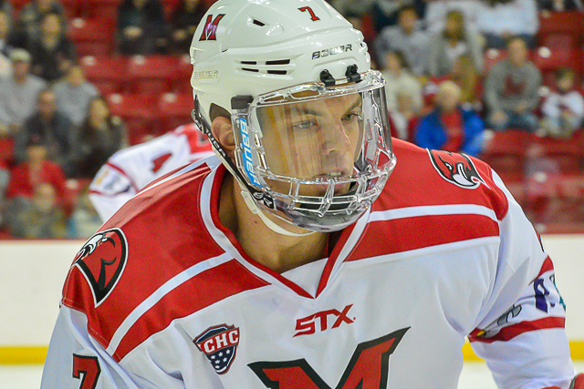 Frederic has the hardest shot on the RedHawks, according to teammate and captain Gordie Green, but offense isn’t a major part of his game. Through 67 collegiate games, Frederic has nine assists.