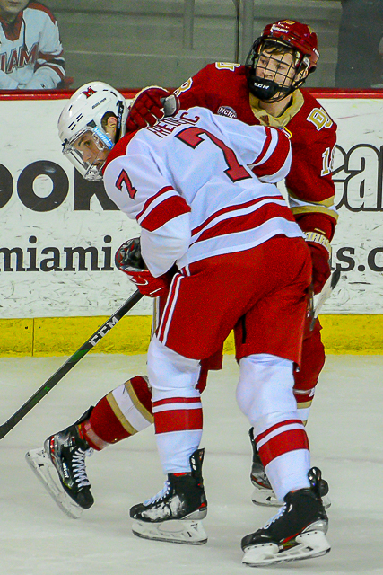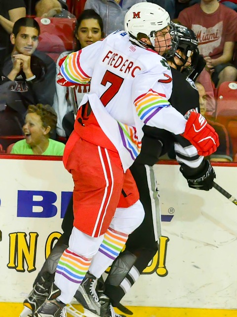 Frederic’s ice-time situation was even worse his junior year. With the addition of freshmen Derek Daschke, Bray Crowder and Andrew Sinard plus graduate senior transfer River Rymsha, Frederic found himself buried on Miami’s defensemen depth chart.